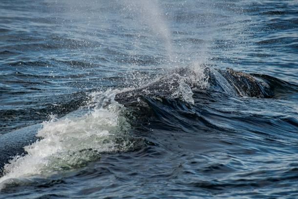 A right whale surfaces as biologists from the Center for Coastal Studies research the mammals in Cape Cod Bay, Massachusetts