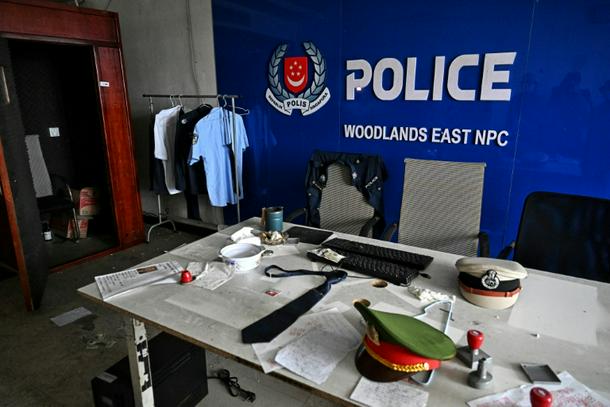A room imitating a Singaporean police station is seen inside an abandoned scam centre in O'Smach town on the Thai-Cambodian border on March 12, 2026