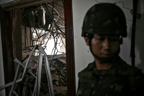 A Royal Thai Army soldier stands inside an abandoned scam centre in O'Smach town on the Thai-Cambodian border on March 12, 2026, during a press trip organised by Thailand's Ministry of Foreign Affairs and the Royal Thai Army