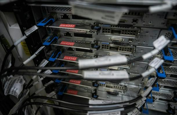 The servers sit in standardized 19-inch (48 cm) racks – essentially metal closets lined up in rows.