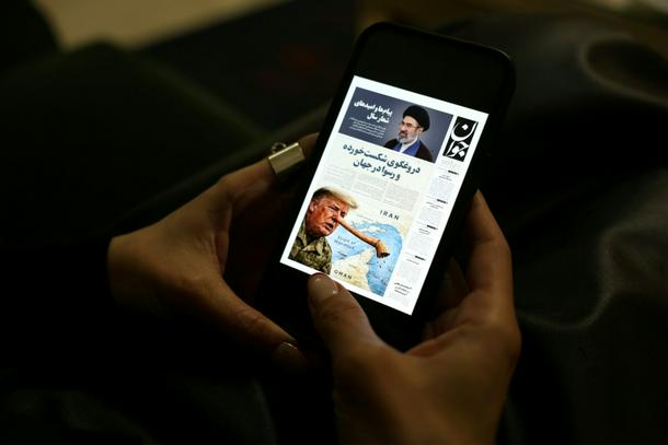 An Iranian woman reads an article portraying US President Donald Trump as a lying Pinocchio