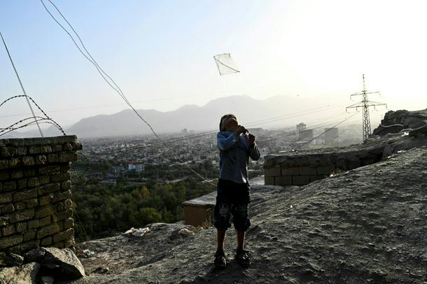 An Afghan boy flies a kite in Kabul on September 29, 2025, after the Taliban authorities cut off internet and telecommunications in the crisis-hit country