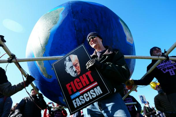 A protester in Washington holds a sign that compares US President Donald Trump to Nazi leader Adolf Hitler