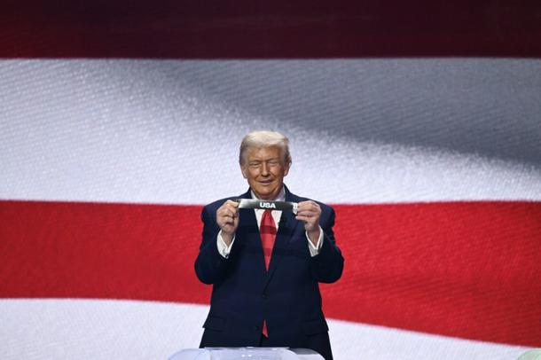 President Donald Trump holds up the card for co-hosts USA at the 2026 World Cup draw