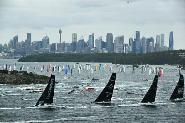 LawConnect, one of five ultra-fast 100-foot supermaxis competing for line honours, led the fleet out of the harbour ahead of highly favoured supermaxi Comanche.