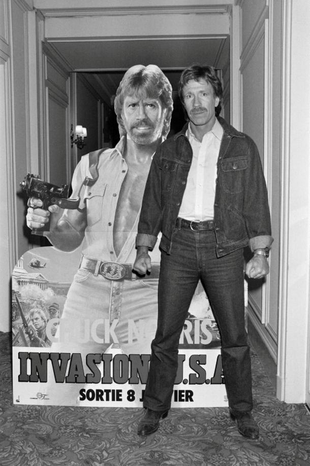US actor Chuck Norris poses on November 27, 1985 in front a movie poster for the movie "Invasion USA" at the Hôtel Plaza Athénée in Paris