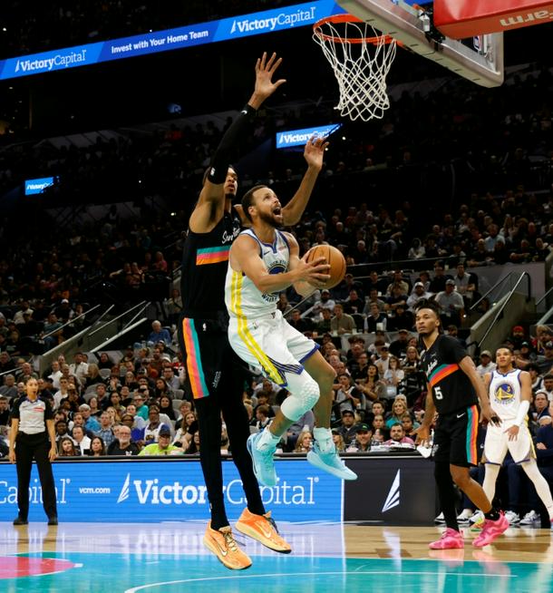 Stephen Curry of the Golden State Warriors scores against Victor Wembanyama in the Warriors' NBA victory over the San Antonio Spurs