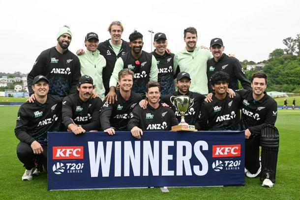 New Zealand players celebrate with the series trophy after beating the West Indies in the fifth T20I at Dunedin
