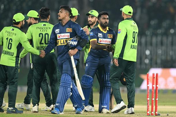 Sri Lanka's players shake hands with their Pakistan opponents after the first ODI in Rawalpindi on Tuesday