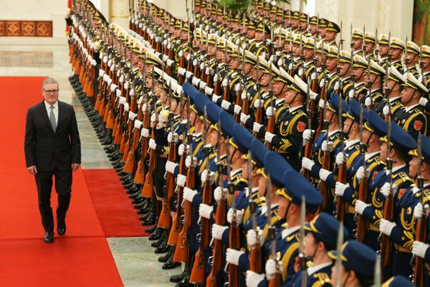 Britain's Prime Minister Keir Starmer inspects a Chinese honour guard with Chinese Premier Li Qiang (not pictured) during a welcome ceremony at the Great Hall of the People in Beijing on January 29, 2026. Chinese President Xi Jinping told Starmer their countries must "strengthen" ties to counter geopolitical headwinds, as the leaders met in Beijing on January 29.