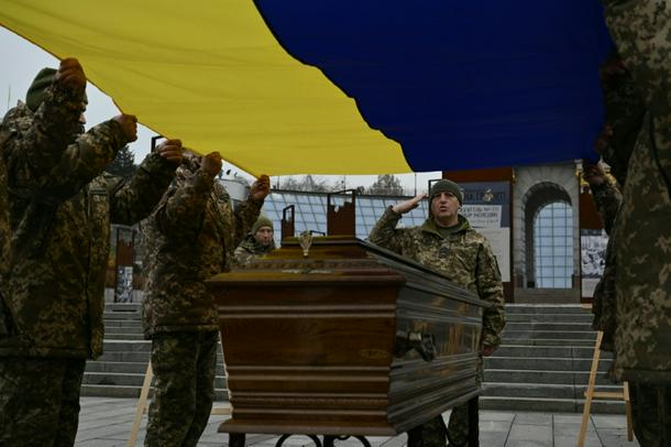 Servicemen from a guard of honour hold a Ukrainian flag over the coffin of late Ukrainian serviceman Kostiantyn Guzenko, 28, during a farewell ceremony in central Kyiv on November 7, 2025