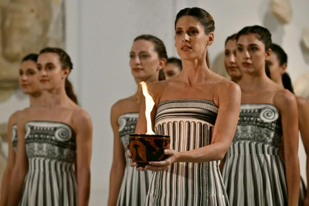 The flame ceremony was flanked by sculptures from the Temple of Zeus, the patron god of the ancient Olympics.