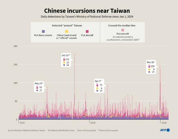 China deploys warships and fighter jets around Taiwan on an almost daily basis, and has launched six rounds of large-scale drills since 2022, most recently in December.