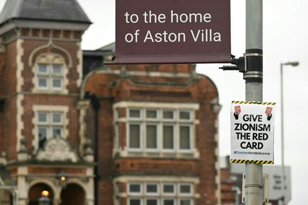 A poster that reads 'Give Zionism the red card' is seen on a lamp post near Villa Park in Birmingham ahead of the Europa League match between Maccabi Tel Aviv and Aston Villa
