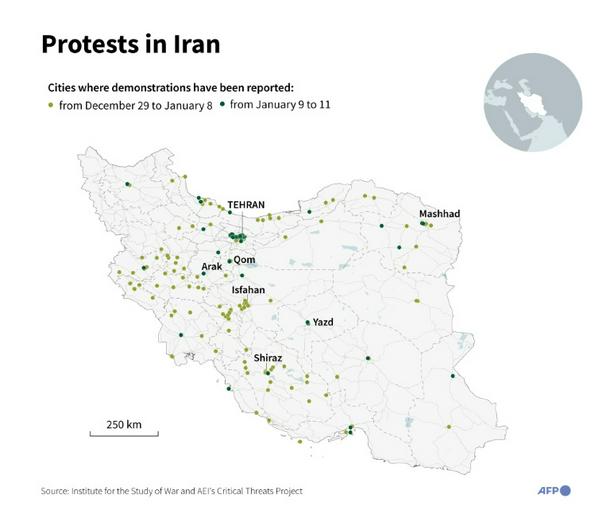 Infographic with map locating Iranian cities where demonstrations were reported between December 29, 2025 and January 11, 2026