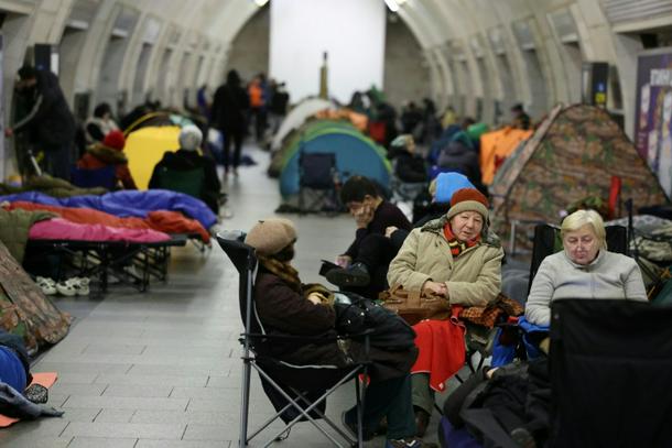 People take shelter at a metro station during Russian air attacks in Kyiv