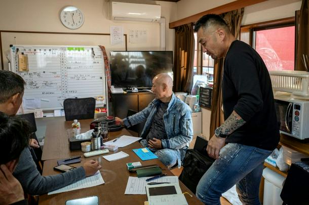 Former yakuza gangster Yoshiro Nishino (R) at his home for ex-offenders in Chiba Prefecture