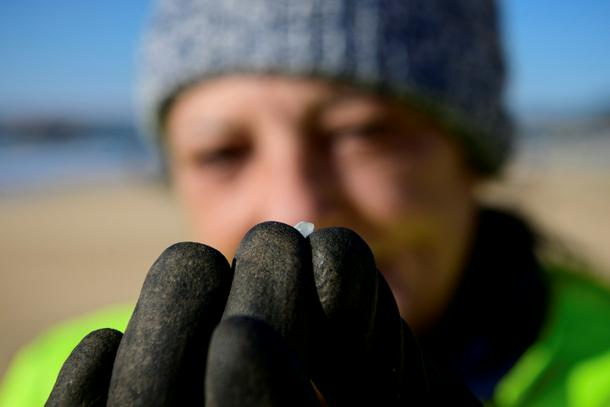 A worker holds a plastic nurdle which washed up at Vilar beach in Corrubedo, northwestern Spain, in 2024