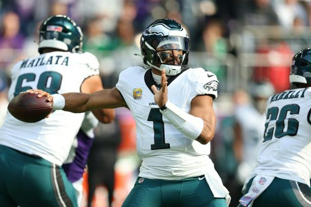 Hurts completed 19-of-23 passes for 326 yards and three touchdowns without an interception to inspire the Eagles over host Minnesota 28-22.
