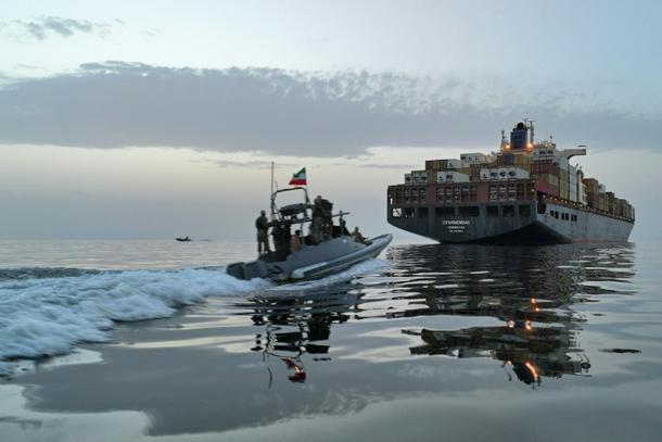 This photo from the Iranian news agency Tasnim shows a Revolutionary Guards boat apparently taking part in an operation to seize ships in the Strait of Hormuz