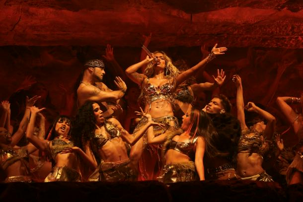 Wearing a gold bikini, she danced in the style of her fellow countrywoman Shakira. Accompanied by a large group of dancers, she used every inch of a stage built to resemble a stone cave.