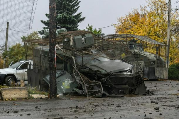 A Ukrainian armoured personnel carrier, damaged during a Russian drone strike, lies at a roadside near Druzhkivka, in the Donetsk region