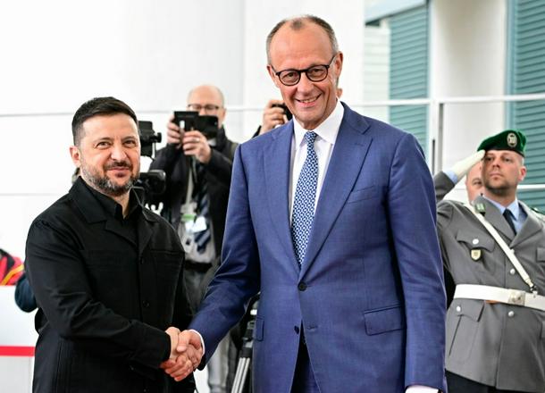 German Chancellor Friedrich Merz greets Ukrainian President Volodymyr Zelensky in Berlin